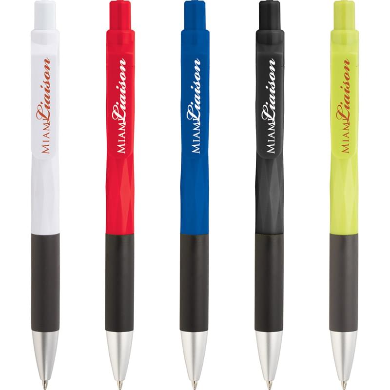 Retractable ballpoint pen with geometric shaped barrel and rubber grip.