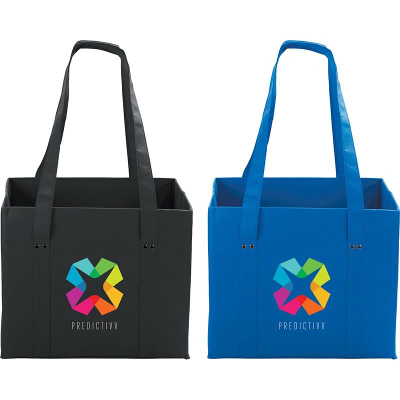 100g non-woven material with supportive board re-inforced on all sides including sewn in bottom board. This tote can completely collapse flat for easy storage when not in use. 12.5'' grab handles.