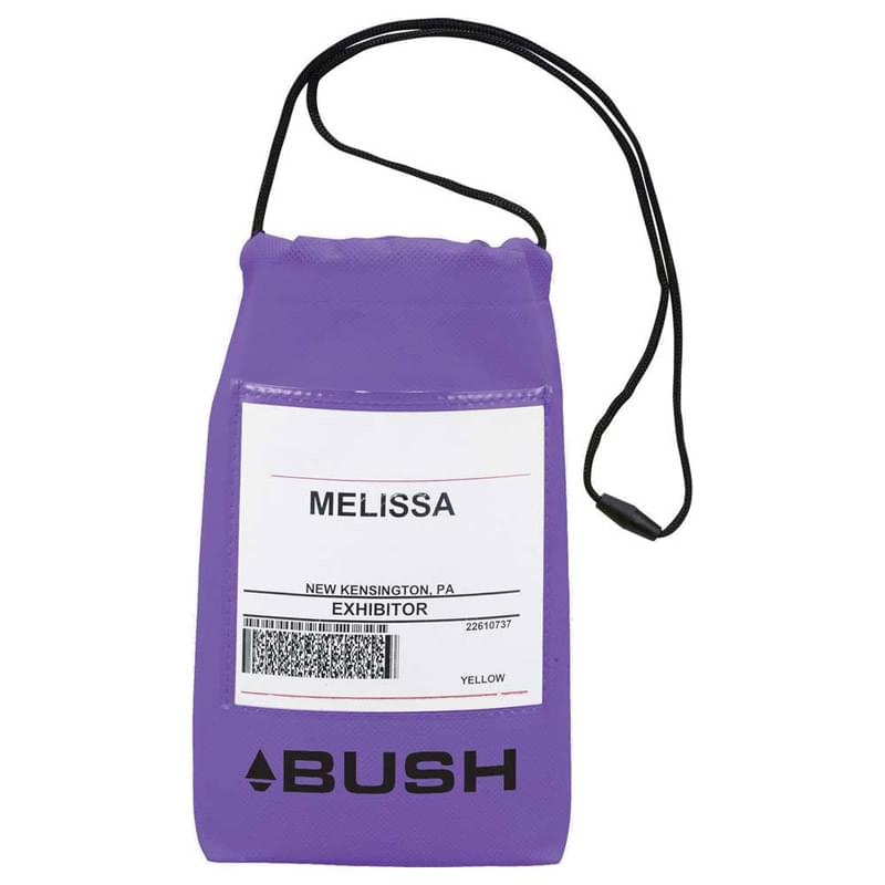 Large main area with drawstring closure. Clear PVC pocket on the front for badge/ID display. Break-away lanyard. Front window size: 4" H x 4.125" W.