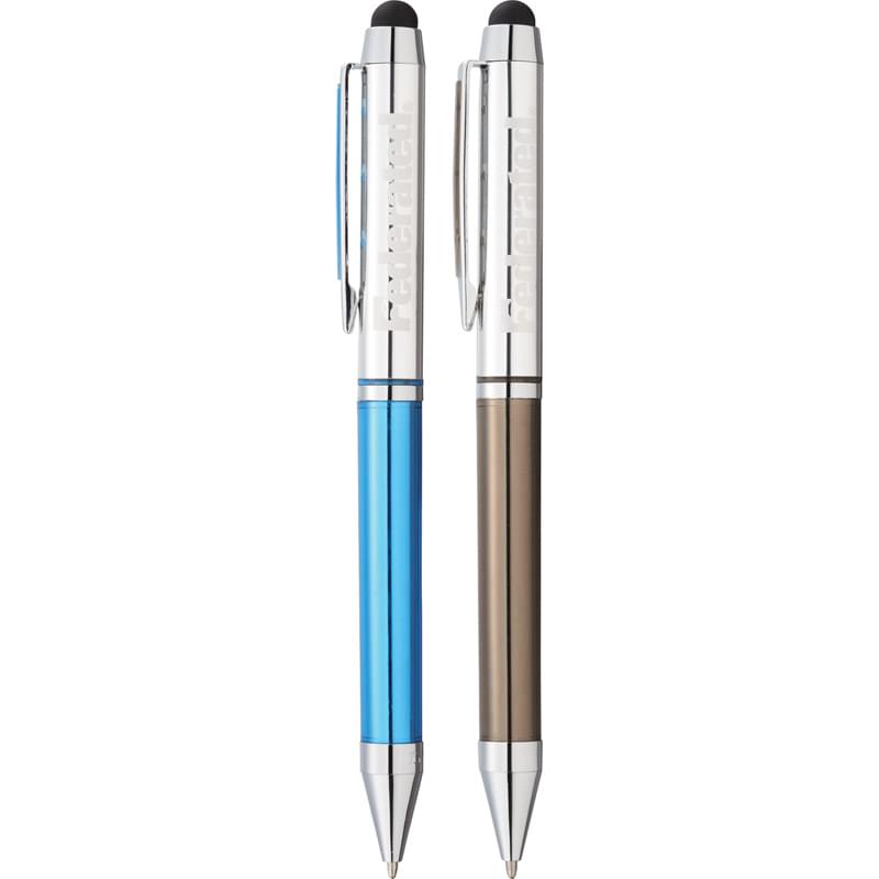 Exclusive Luxe design. Translucent bottom barrel with polished chrome upper barrel. Soft, rubber touch stylus. Subtle Luxe branding etched on bottom barrel. Pen includes premium black ballpoint ink. Includes Luxe gift packaging.