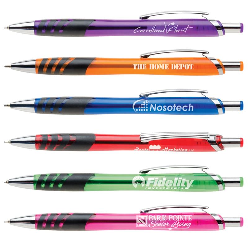 Translucent hourglass barrels in vibrant brights which create vivid stripes through the black rubber grip. Sculptured chrome clip and accents add to eye-catching appeal. Supersmooth writing black hybrid ink.